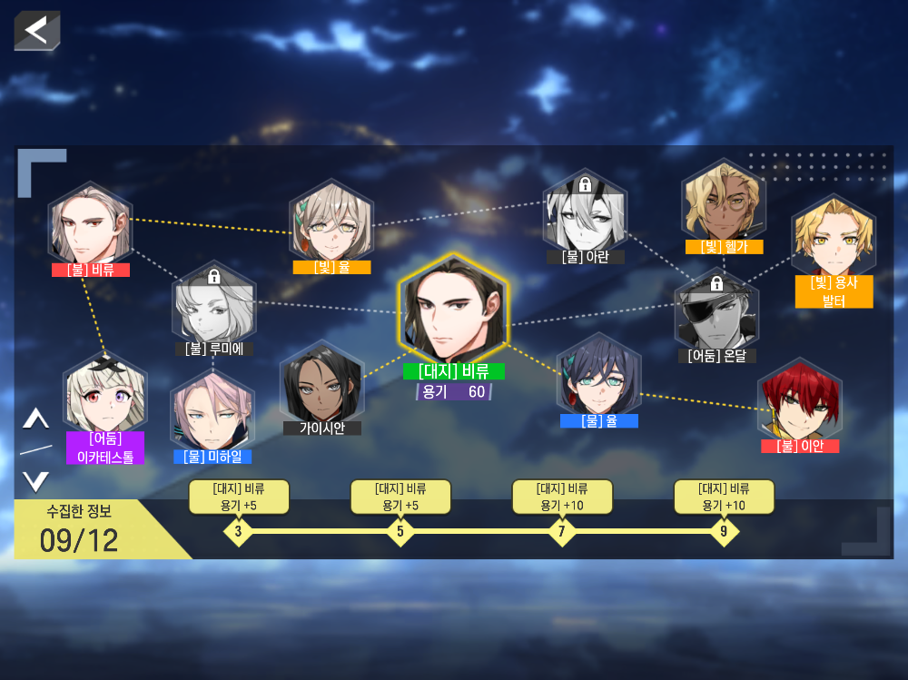 사진에서는 어둠 온달과 물 아란이 비활성화 되어 있지만, 각성 완료하고 스킬 올려두니 둘도 풀렸습니다. 아직 불 루미에만 비활성화 상태고요. 여기서 새로 등장한 캐릭터는 빛 율, 물 아란입니다. 불 이안은 이미 영입 완료했으니 다음 차례는 빛 율과 물 아란이겠네요. 빛 율이 네 사신수 중에서는 가장 늦게 나왔지만, 두셋씩 나온 다른 사신들을 생각하면 나올 가능성이 가장 높습니다. 비류는 대지, 불, 어둠의 세 속성이 있고, 이안도 빛, 물, 불의 세 속성이 있으니까요. 아란도 대지와 불 둘이 있고 그 다음 예정이 물 아란인 셈입니다.