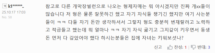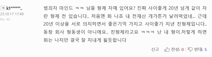 형과 형의 가족 문제를 어떻게 끌고 갈지 궁금하지만 그건 작가님이 알아서 하시겠지요. 하지만 저 댓글의 이야기는 동의하지 못하는 고로 블로그에 끄적여 남겨봅니다. 주인공이, 동생이 저런 형과 연을 끊은 것은 잘 했다고 생각합니다. 이미 어릴 적의 기억까지 꺼내 파묘한 상황에서 둘이 화해할 가능성은 낮지요. .. 아마도?