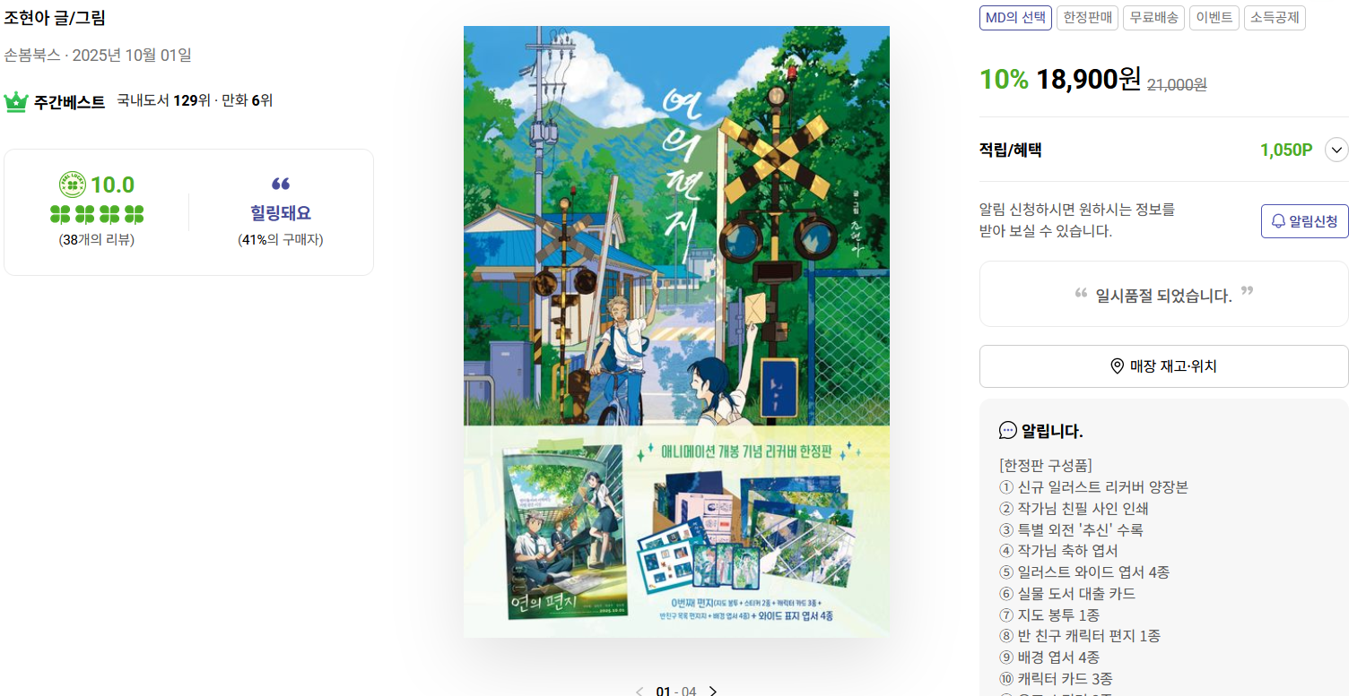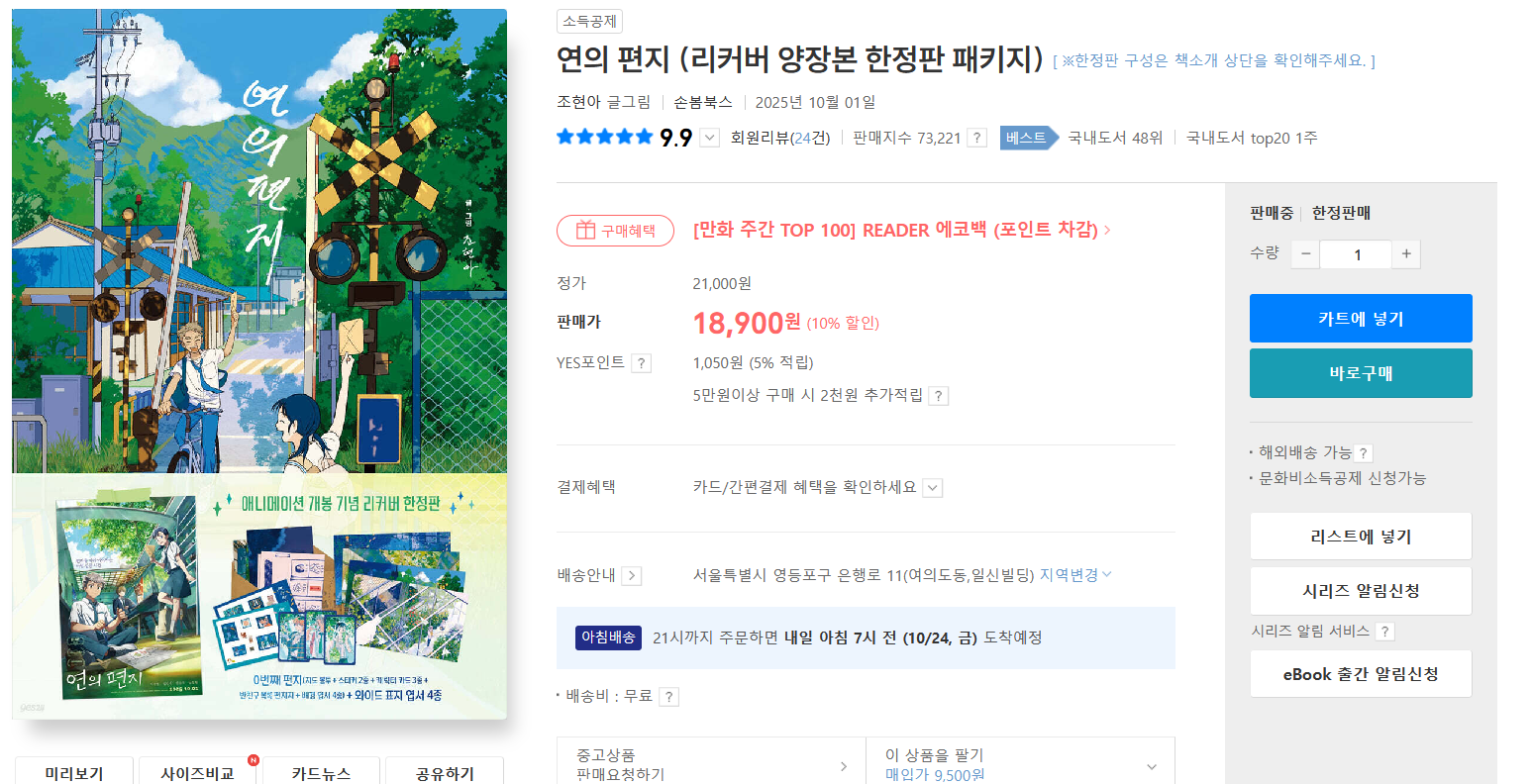 ※ 한정판 패키지 구성『연의 편지 (리커버 양장본, 작가 친필 사인 인쇄본)』 + 「0번째 편지」(지도 봉투 1장 + 캐릭터 카드 3장 + 우표 스티커 2장 + 반 친구 캐릭터 편지 1장 + 배경 엽서 4장) + 표