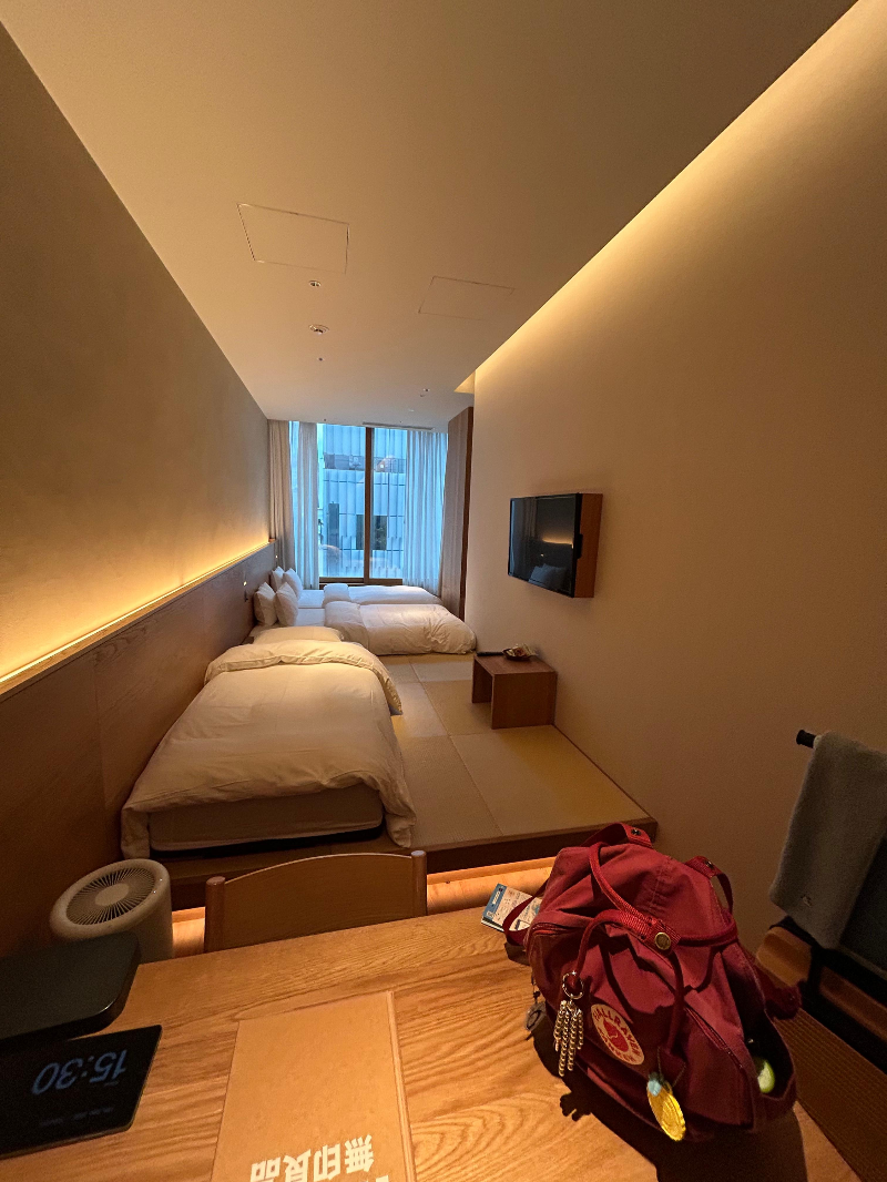 가장 앞에 보이는 침대가 추가침구입니다. 저건 L의 몫이었던 걸로 기억합니다. 아침에 일어나 보니 G 옆자리에 끼어 들어와 있었지만 뭐. 추가 침대가 들어간 자리는 원래 TV를 보는 소파 자리죠. 거기 놓였어야 하는 작은 탁자도 함께 있습니다. 저기에는 웰컴푸드도 있었고, 당연히 무인양품 과자입니다. 맥주 안주용 과자였다고 기억하고요. 냉장고에도 물이 들어 있었고, 검은콩물이었던가요. 생수는 아니고 차였다고 기억합니다. 캡슐은 커피가 아니라 차였다고 기억하고, 그래서 드립백은 한국에서 챙겨간 드립백으로 대신했습니다. 무인양품에도 드립백이 있지만 호기심에 한 번 먹을 정도라서 그냥 따로 가져갔지요.