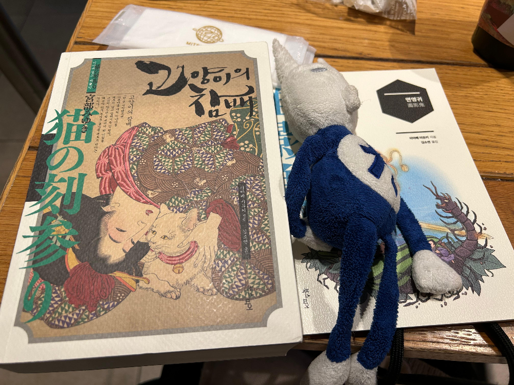 그리고 드디어. 여행 내내 끼고 다녔던 『고양이의 참배』가 드디어 끝났습니다. 오른쪽에 태공이 깔고 누운 『면영귀』는 함께 딸려온, 그래서 함께 들고 온 특별 외전입니다. 원래는 금요일에 서울 올라가면서 다 읽어야지 했다가, 책이 끝나지 않는다면서 고민하고는 그냥 배낭에 집어 넣었거든요. 시간 날 때마다 여행 다니는 틈틈이 읽었는데, 여행이 끝나기 전에 다 읽었습니다. 다행입니다. 왜냐하면 그 다음 타자가 G거든요. 여행 기간 내내 붙들고 읽은 것도, G에게 짐을 떠넘기기 위해서였습니다. 인천공항에서 바로 내려갈 건데, 그 전에 짐정리하면 좋잖아요. G도 그 사실을 알고 있다보니 체념하고 책을 받아 들었습니다. ㅋㅋㅋㅋㅋㅋ