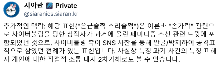 추가적인 맥락: 해당 표현("은근슬쩍 스리슬쩍")은 이른바 "손가락" 관련으로 사이버불링을 당한 창작자가 과거에 올린 페미니즘 소신 관련 트윗에 포함되었던 것으로, 사이버불링 측이 SNS 사찰