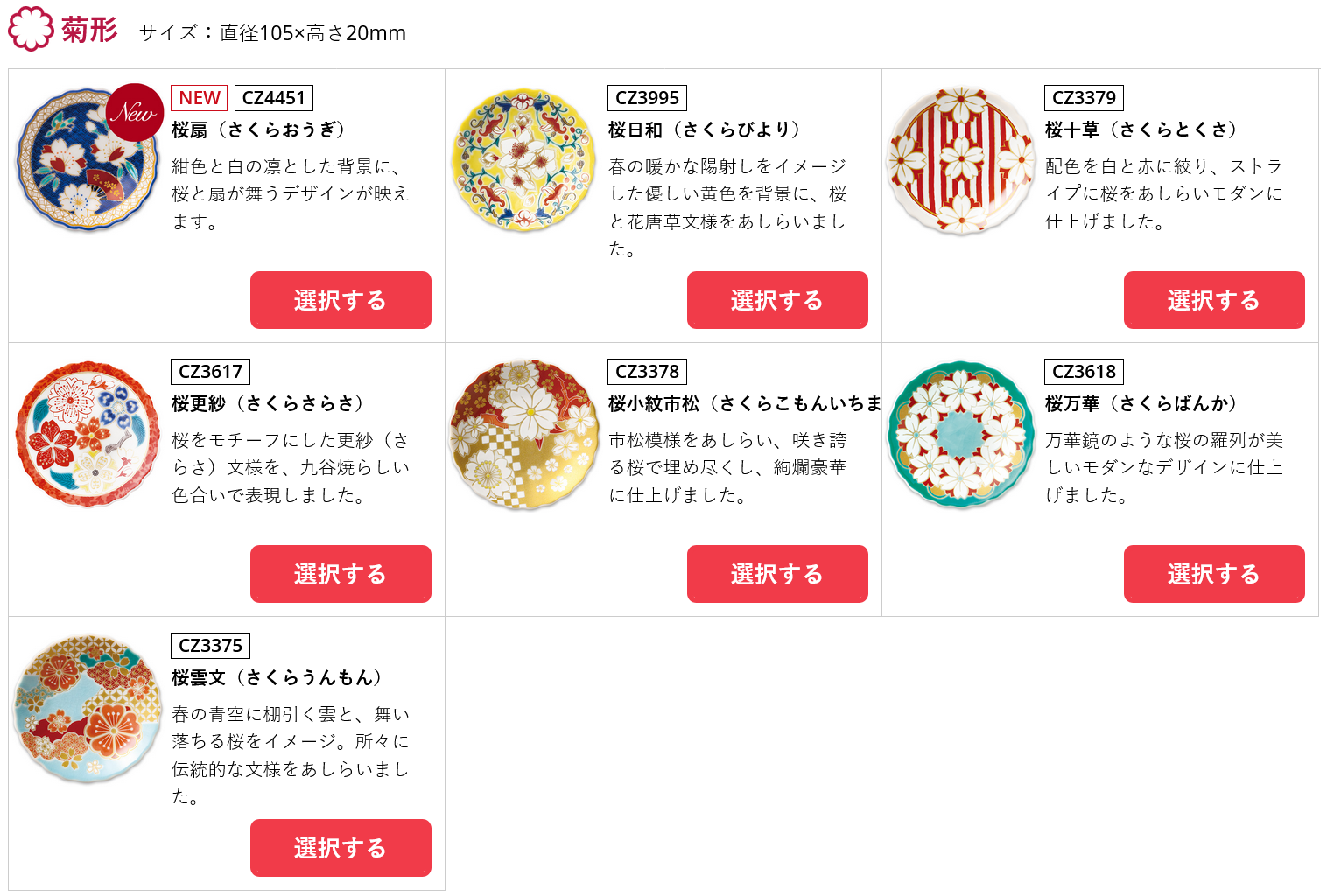 모양이 크게 두 종류입니다. 하나는 동그란 접시. 그래서 환형(丸形)이고, 다른 하나는 국화형(菊形). 크기는 국화형이 아주 조금 큽니다. 가장자리가 둥근 접시는 직경 95mm에 접시 높이가 18mm로 약간 옴폭한데, 가장자리가 꽃잎 처럼 톱니바퀴 장식이 있는 장식 접시는 직경 105mm, 높이 20mm랍니다.
