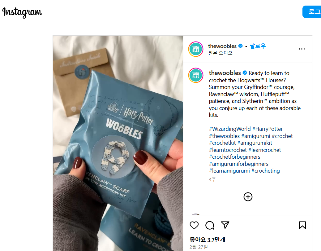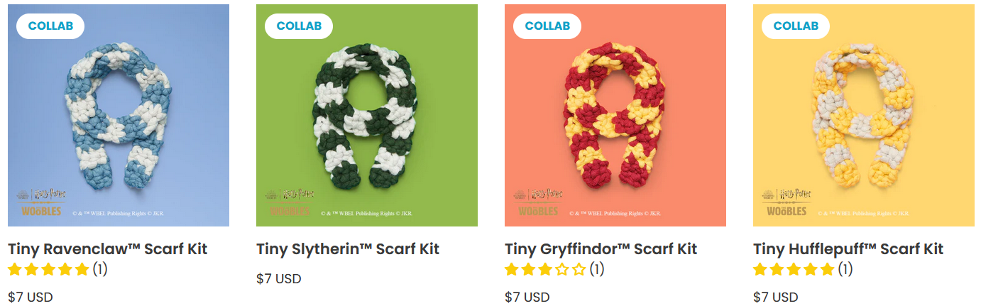 코바늘뜨리고 제작하는 해리포터 상품입니다. 캡쳐 사진에 보이는 것은 래번클로의 스카프-목도리네요. 저 키트안에 미니 목도리를 뜰 수 있는 실과 래번클로 디자인의 코바늘이 함께 있습니다. 뭔 소리냐 하면, 판매 링크를 찾아 들어가면 압니다.